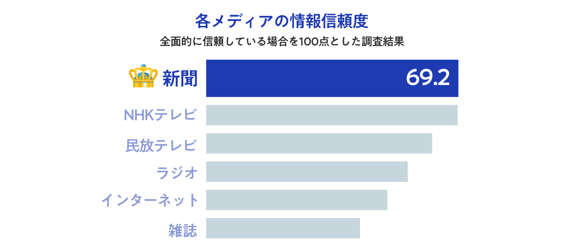 毎日発行される新聞は、日常生活に溶け込んだメディアです。「新聞を読む習慣」が身についている人が多いため、なにか他のことをしながらの「ながら見」ではなく、しっかり内容を読み込む読者が多いことも特徴のひとつと言えます。そのため新聞の情報に対する信頼も厚く、さまざまなメディアの中でトップの信頼度を誇っています。とくに新型コロナウイルスの流行下では、信頼できる情報源として多くの人に重要視されています。